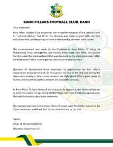 Kano Pillars have terminated the contract of Ex-sporting Lagos gaffer Paul Offor on mutual ground