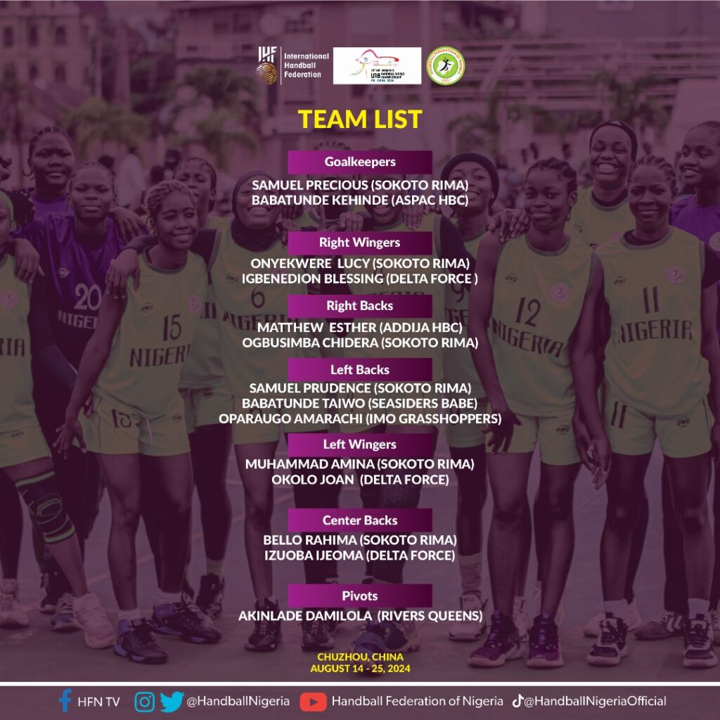 Nigeria’s Women Under 18 Handball team, Coach Adewunmi Agboola Shittu has unveiled his final list of players that will represent the country at the 10th IHF Women’s Under 18 Handball Championship in China.