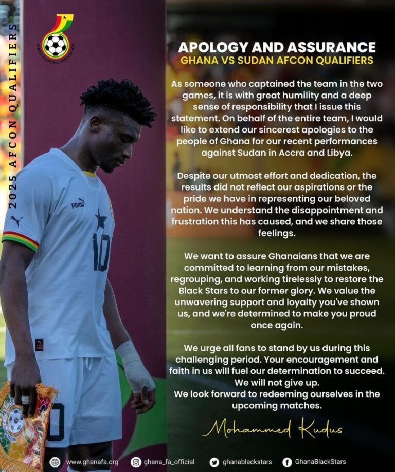 New Black Stars captain, Mohammed Kudus has issued an apology to Ghanaians on behalf of the team. The...