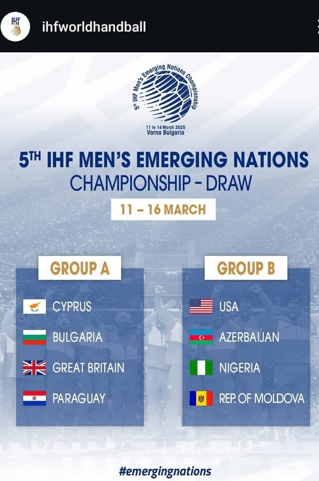 By Sportsgister Nigeria's under 23 Men Handball team will play the USA and Azerbaijan in Group B...