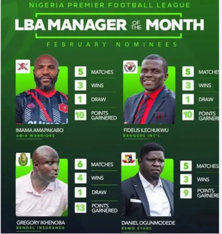 By Sportsgister Four managers have been shortlisted for the Nigeria Premier Football League, NPFL, Coach of the Month...