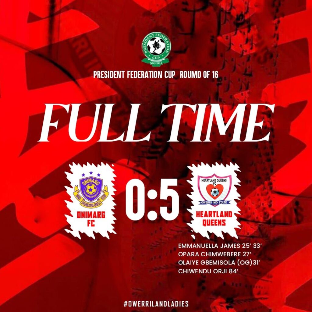 Heartland Queens FC of Owerri produced a scintillating performance to dismantle Onimarg FC of Ondo 5-0 in a one-sided Round of 16 clash at the main bowl of the Samuel Ogbemudia Stadium, securing a comfortable passage into the quarterfinals of the 2025 President Federation Cup.