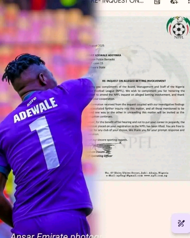By Sportsgister The Nigeria Premier Football League (NPFL) has lifted the suspension placed on goalkeeper Adewale Adeyinka...